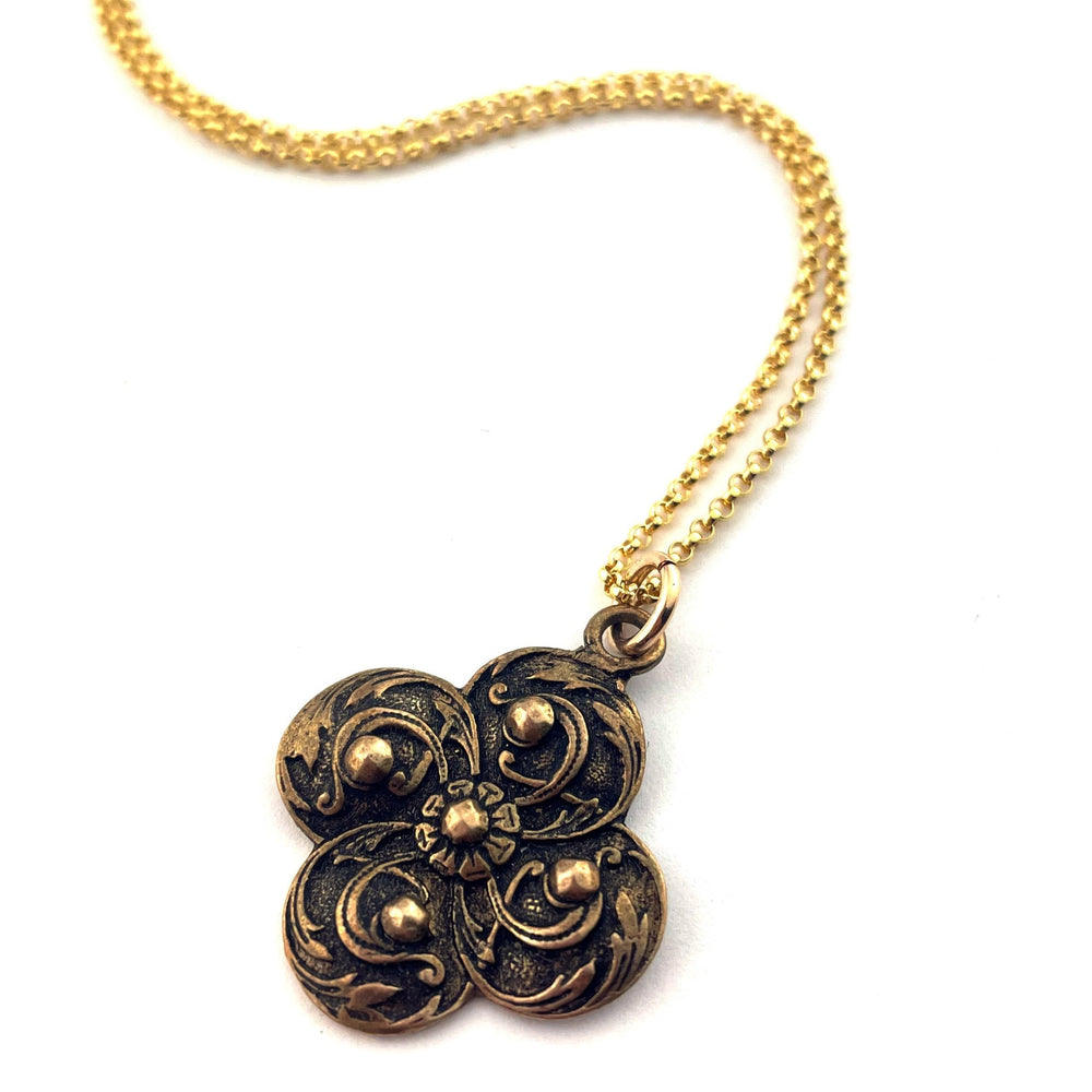 Our Gateway charm evokes ancient and botanical symbolism with its quatrefoil shape, swirling movement and shimmering hammered rivets. Thoughtfully crafted from a Victorian button, adorned with hand hammered rivets and elevated to an heirloom. Hand cast in solid bronze