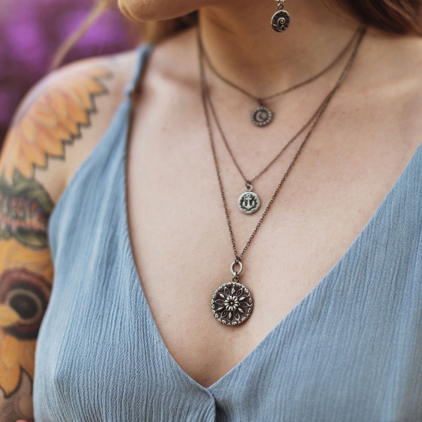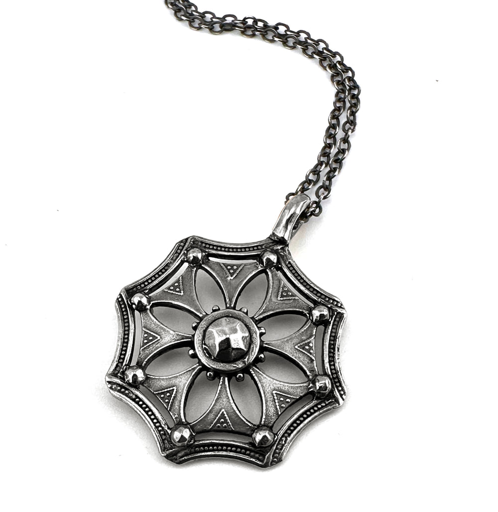 Our Lucid charm is inspired by the ornate backplate of an 18th century French clock adorned with sparkling Victorian cut steel rivets - hand cast in solid sterling silver. This design conjures mandalas and rose windows and the compass rose.