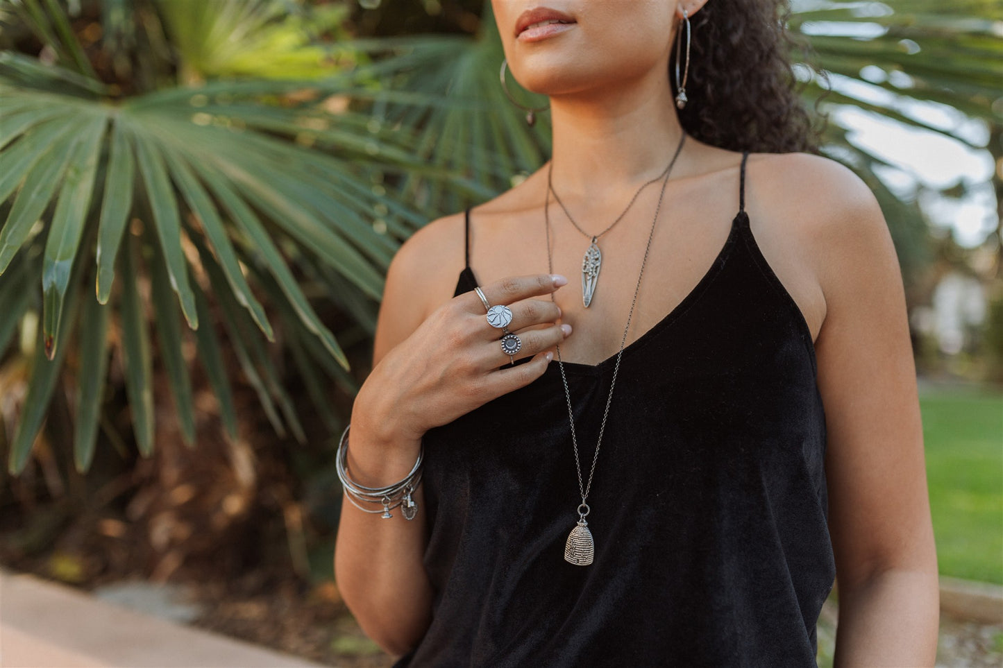 - 1 1/2 inch tall on antiqued sterling silver chain