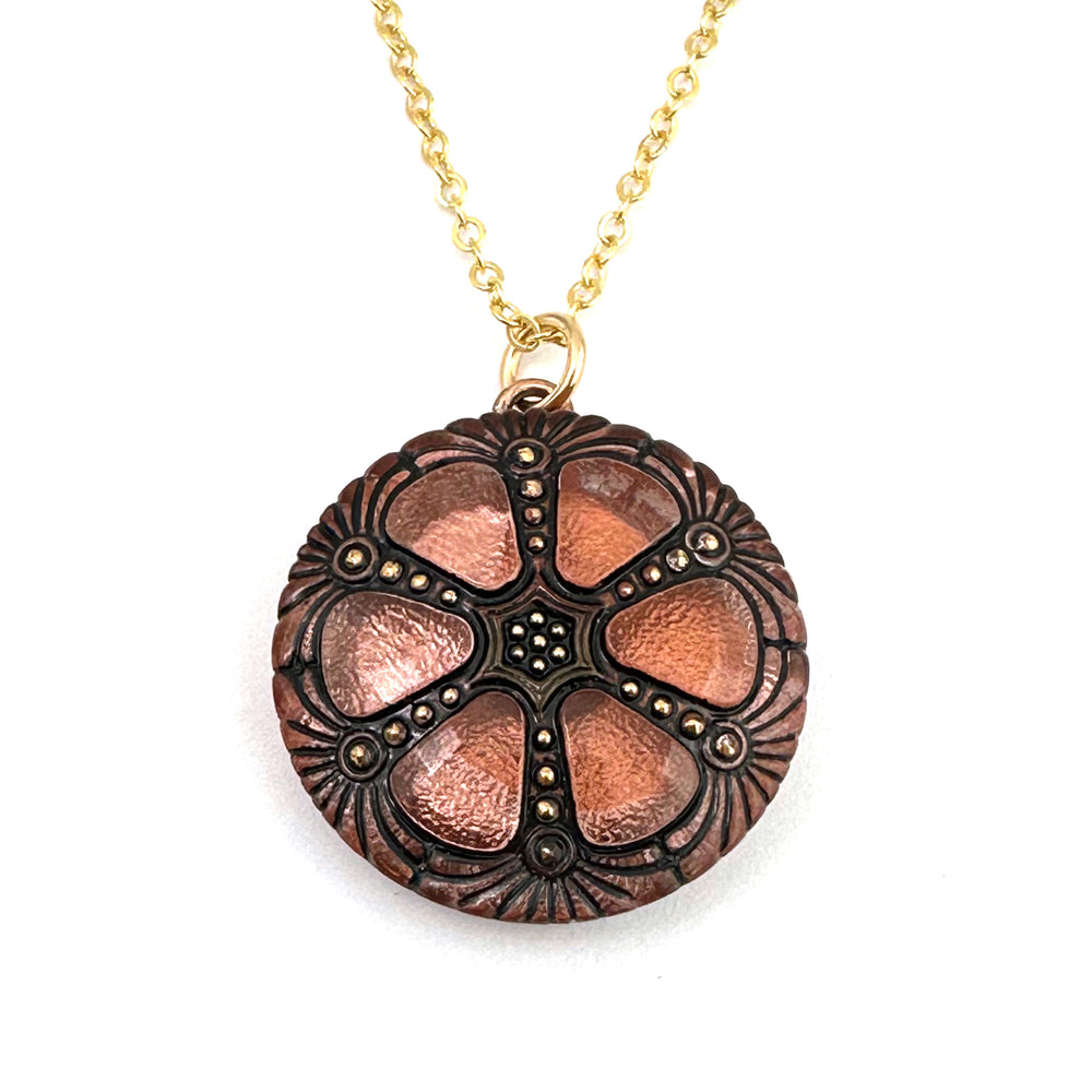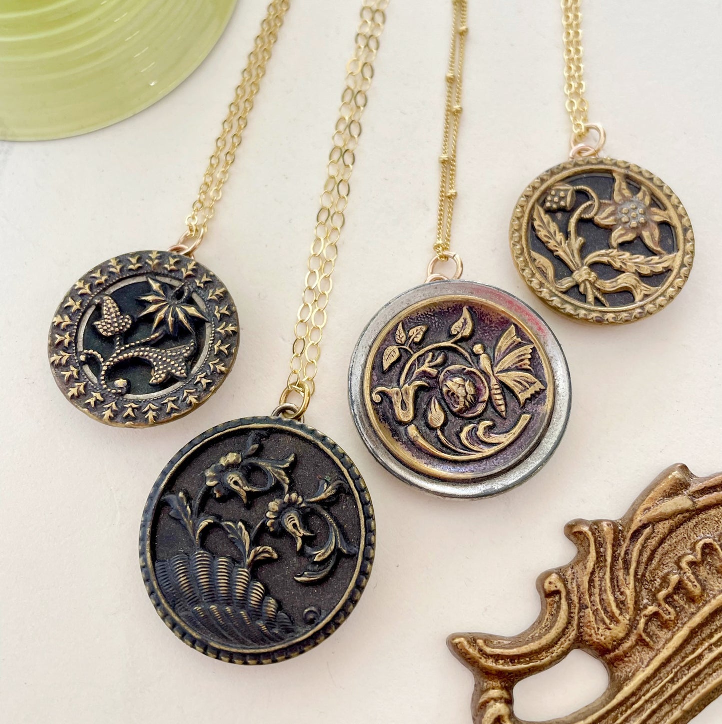 Original antique buttons, 1870-1970 in our signature settings in gold and bronze.