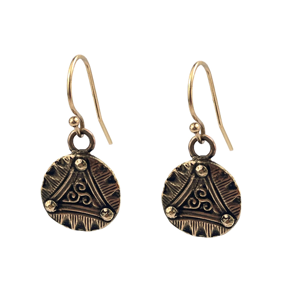 Among the most ancient of human symbols, these Triskele triple spiral earrings are made from Victorian buttons adorned with 18th century cut steel rivets, hand cast in solid bronze.