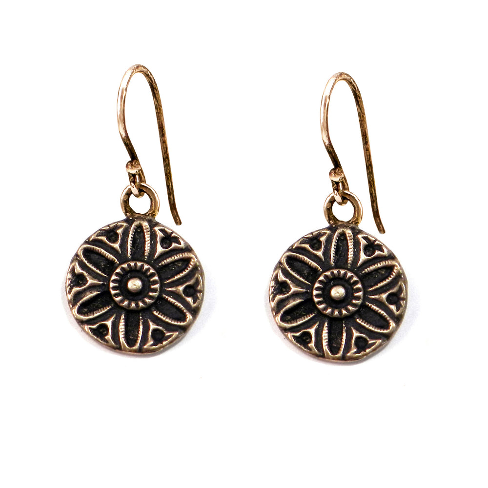 Our vintage Sun Blossom earrings are made from Victorian buttons cast in recycled bronze to make a forever keepsake. Handmade in California from recycled metals. This design conjures sunflower blossoms and rose windows and sunshine.