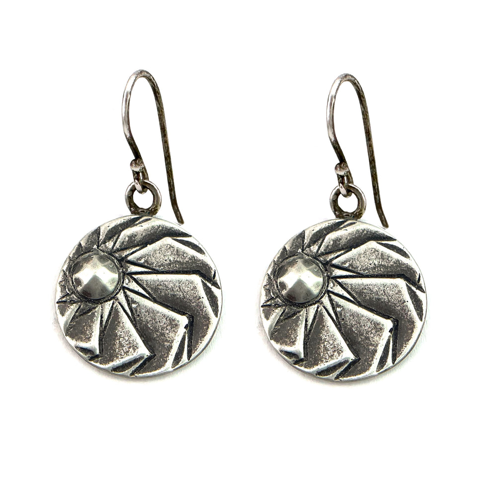 Our Horizons earrings are made from original art deco buttons cast in solid recycled silver. This design features images of sunlight on mountain slopes or shimmering waves. Sunshine. Mountain. Waves. Coast.