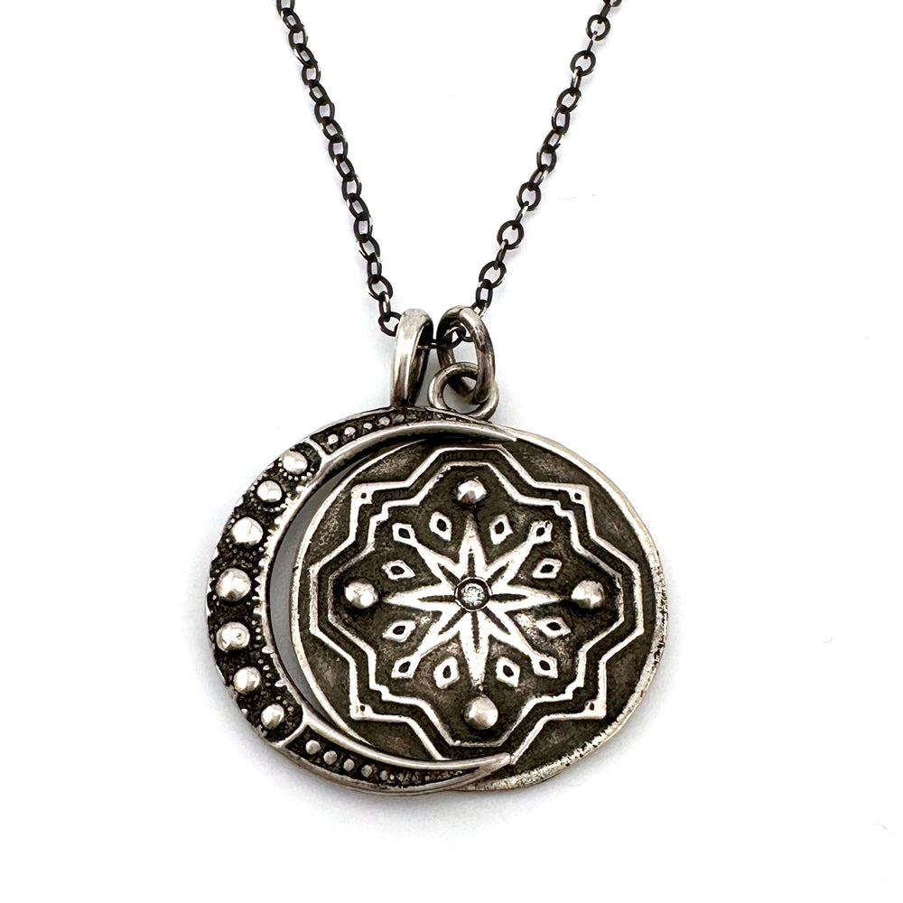 Our Compass Moon necklace set pairs two of our best selling celestial necklaces: a crescent moon and a compass rose. This set conjures the night sky and the far reaches of the four directions. Made from a vintage button adorned with a 18th century hammered rivets adorned with a white diamond at the center of the compass.