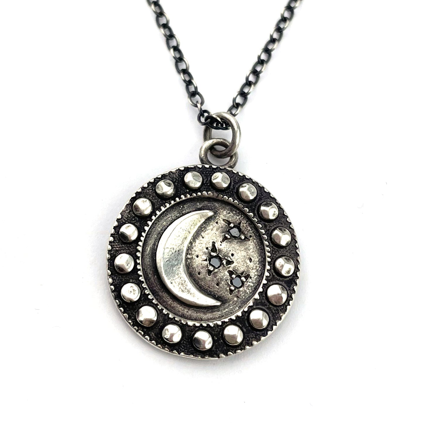 Our larger Crescent moon, made from a Victorian button with faceted cut steel rivets and hand carved stars. We've elevated this humble object into a forever heirloom, hand cast in sterling silver.