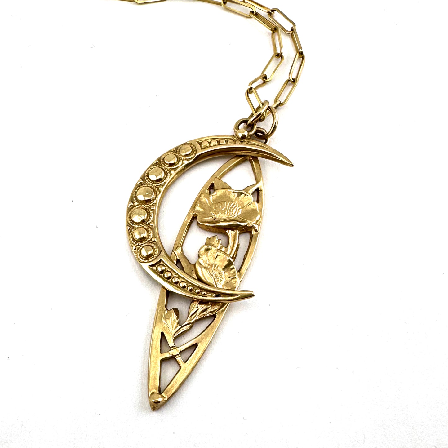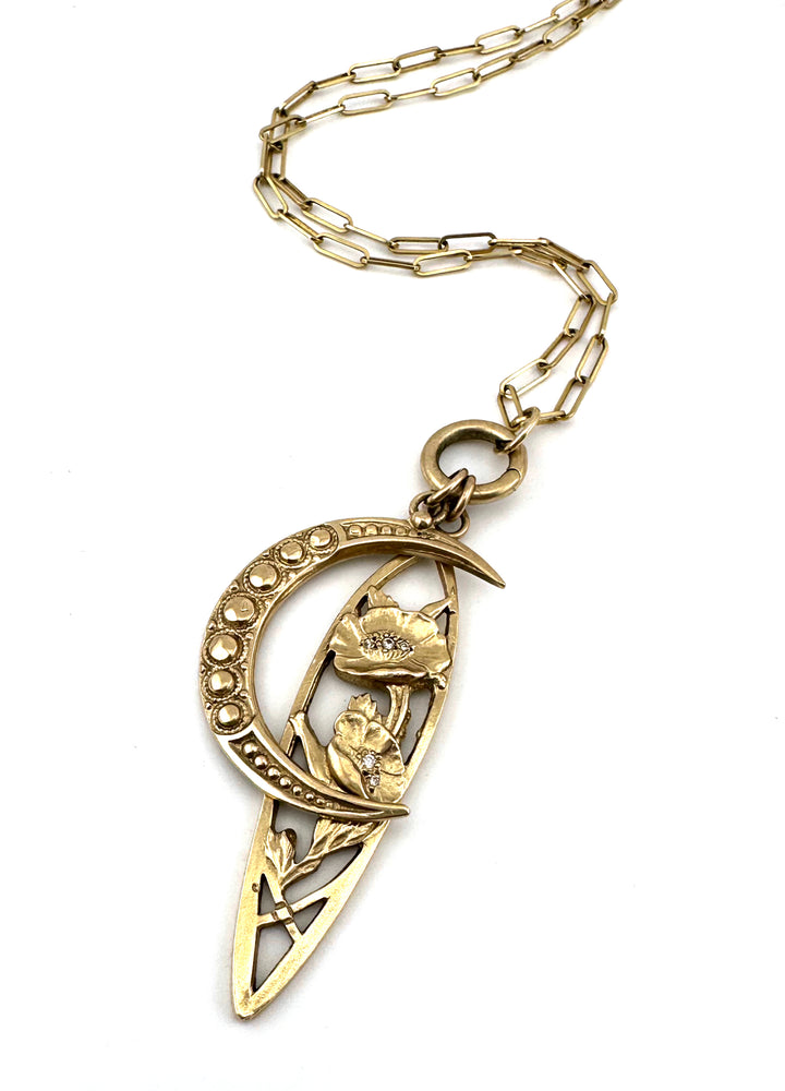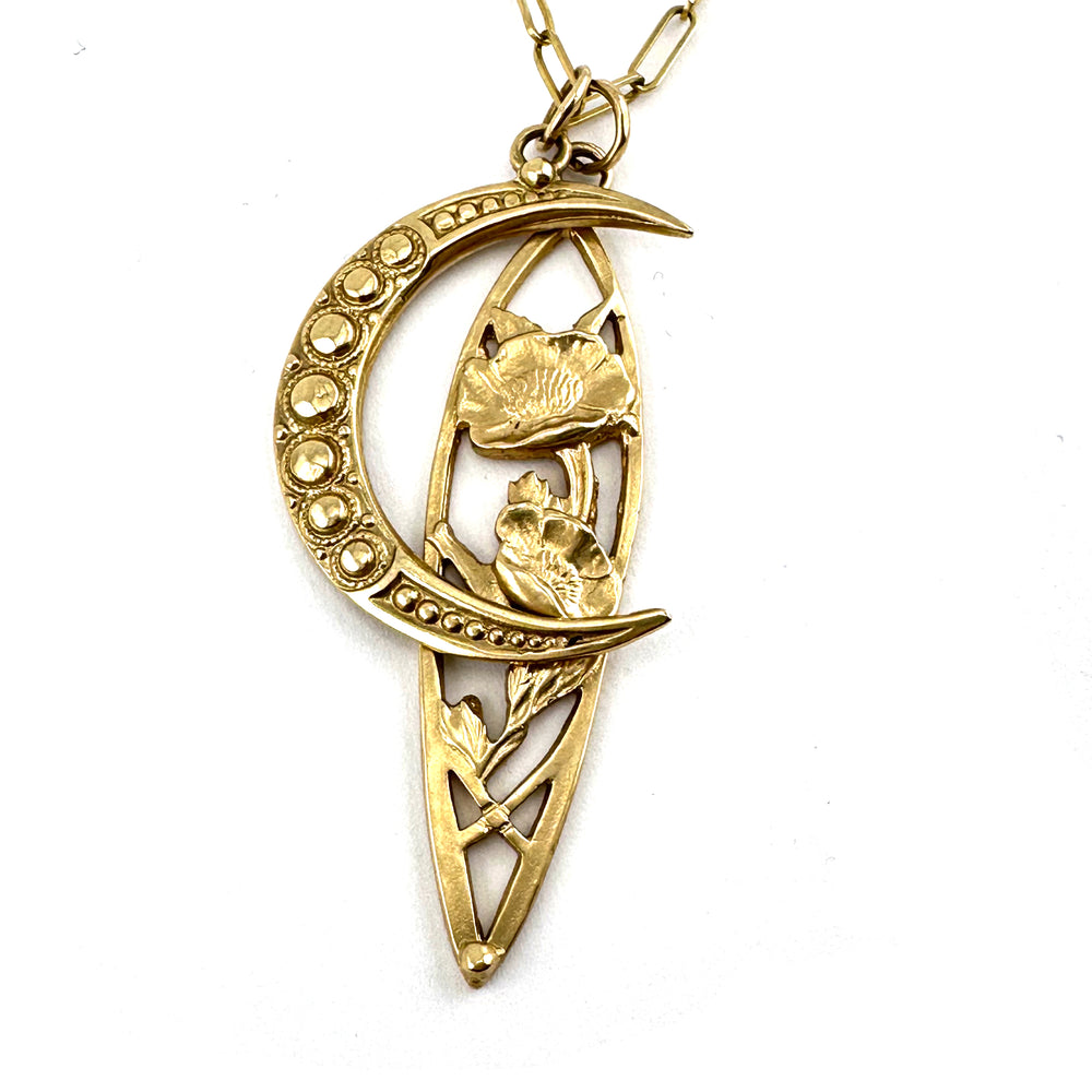 The Poppy Moon necklace set unites our bestselling Poppy teaspoon necklace with our riveted crescent moon. Thoughtfully made from antique buttons adorned with 18th century hammered rivets hand cast in solid 10k or 14k gold.