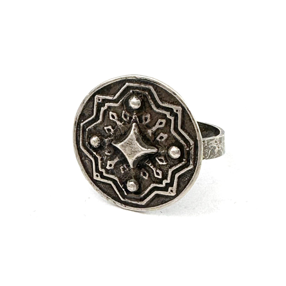 A centering compass rose ring with raised diamond rivet accent. Hand cast from an antique button in solid sterling silver set on a handmade sterling silver band.