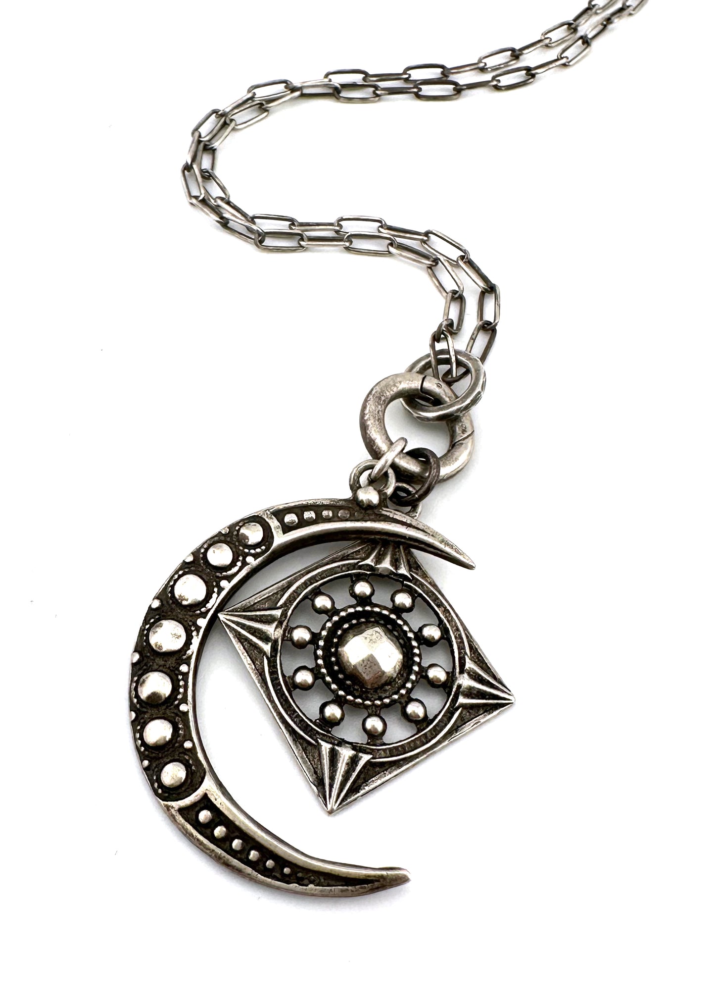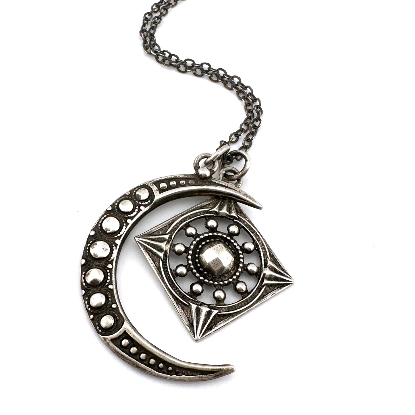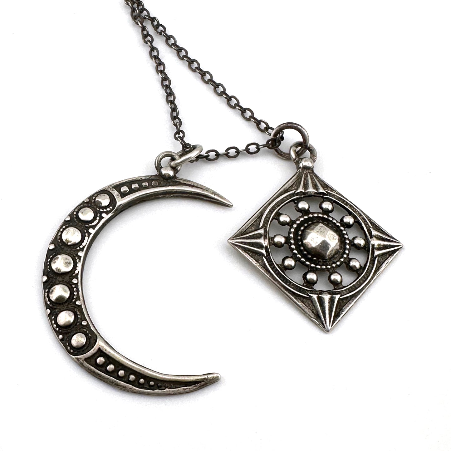 The Focus Moon necklace set brings together our shimmering crescent moon and diamond shaped Focus charm. Crafted from antique buttons adorned with 18th century hammered rivets hand cast in solid sterling silver.