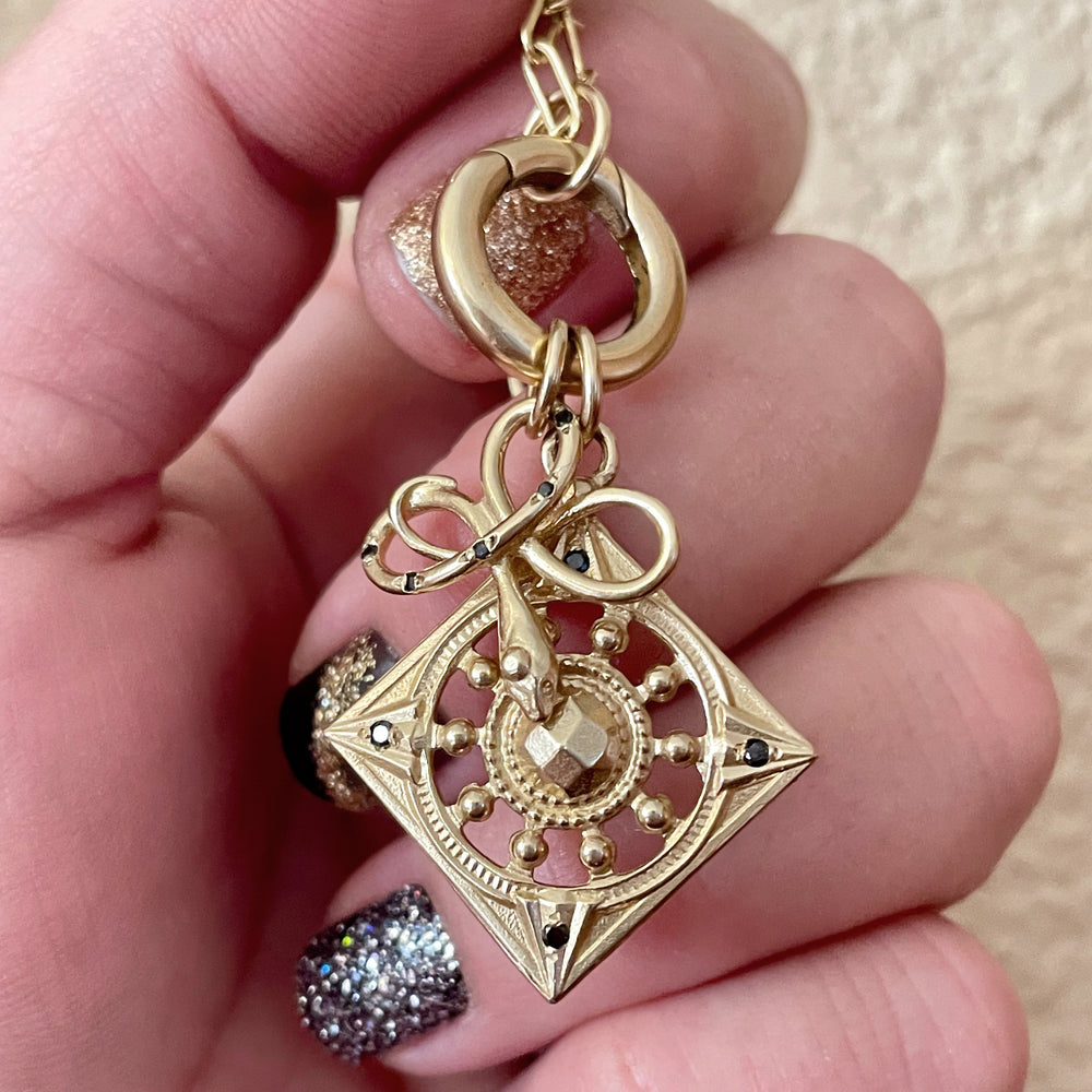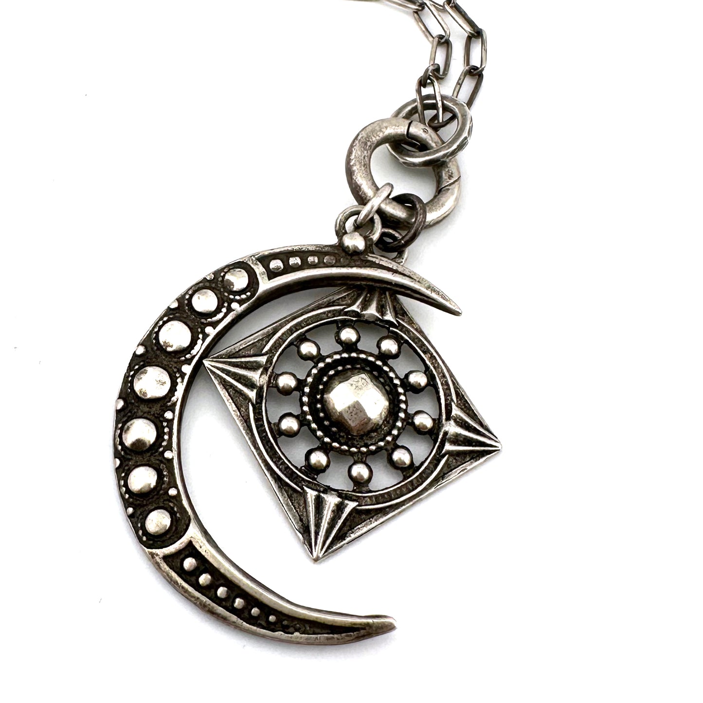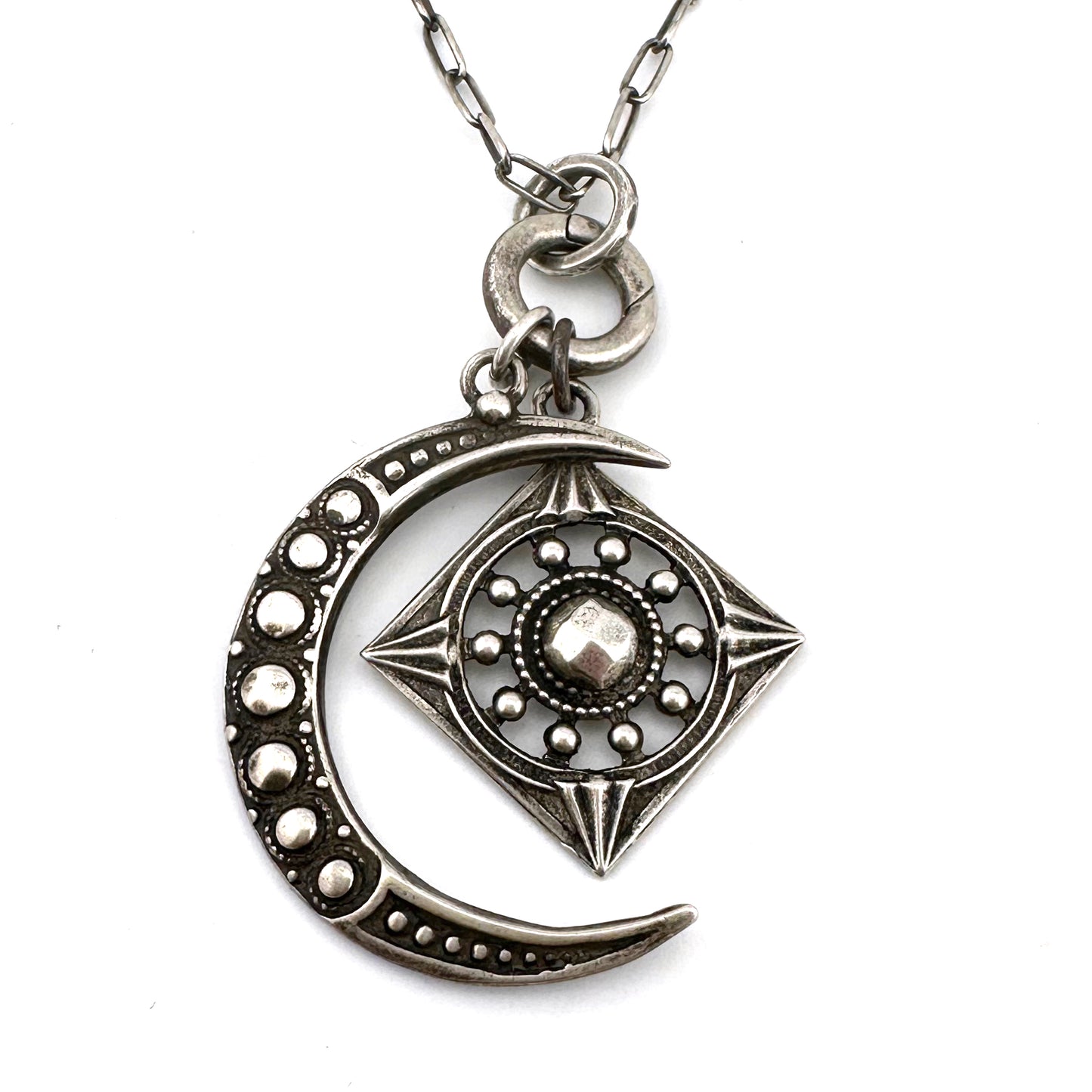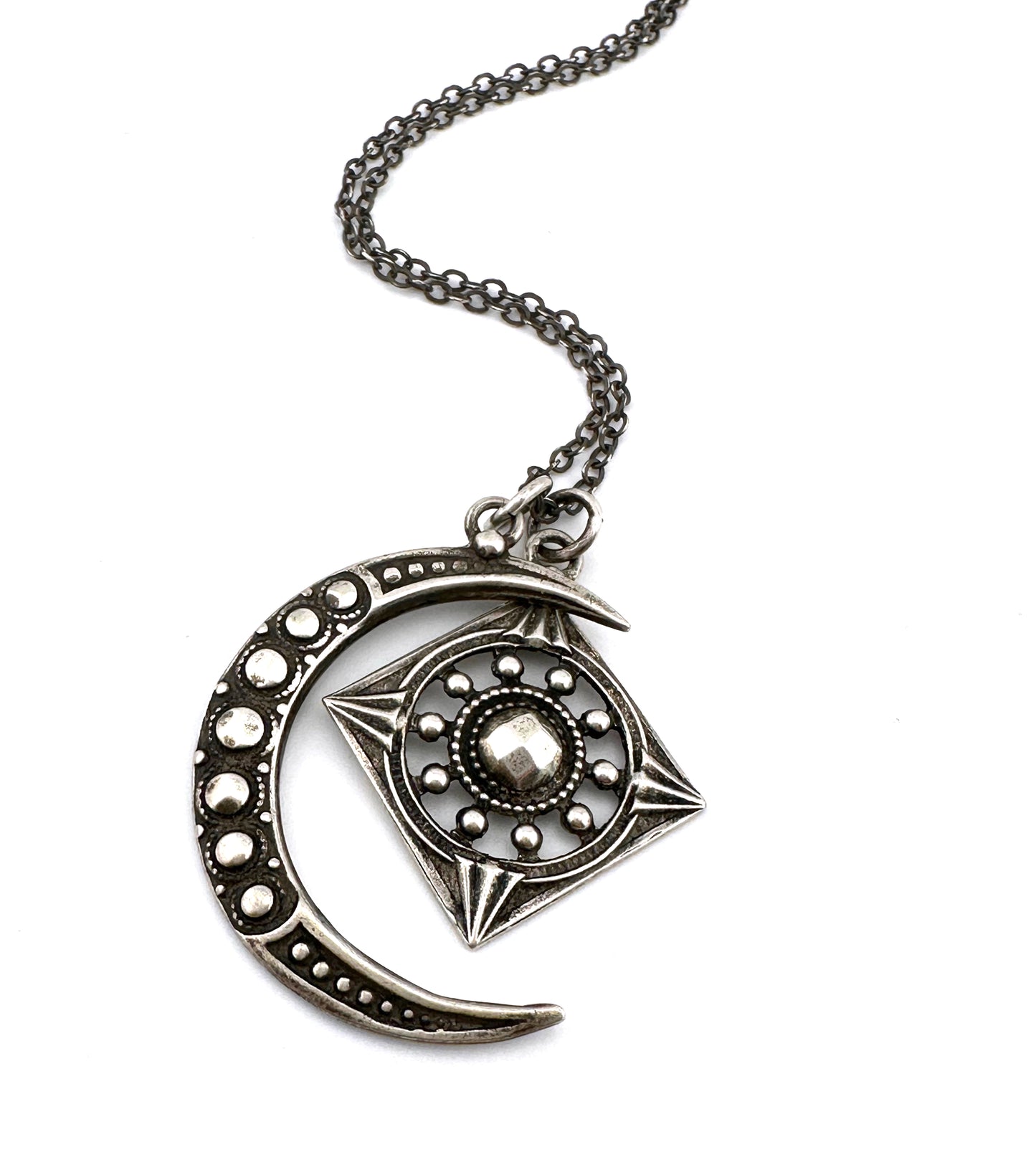 The Focus Moon necklace set brings together our shimmering crescent moon and diamond shaped Focus charm. Crafted from antique buttons adorned with 18th century hammered rivets hand cast in solid sterling silver.