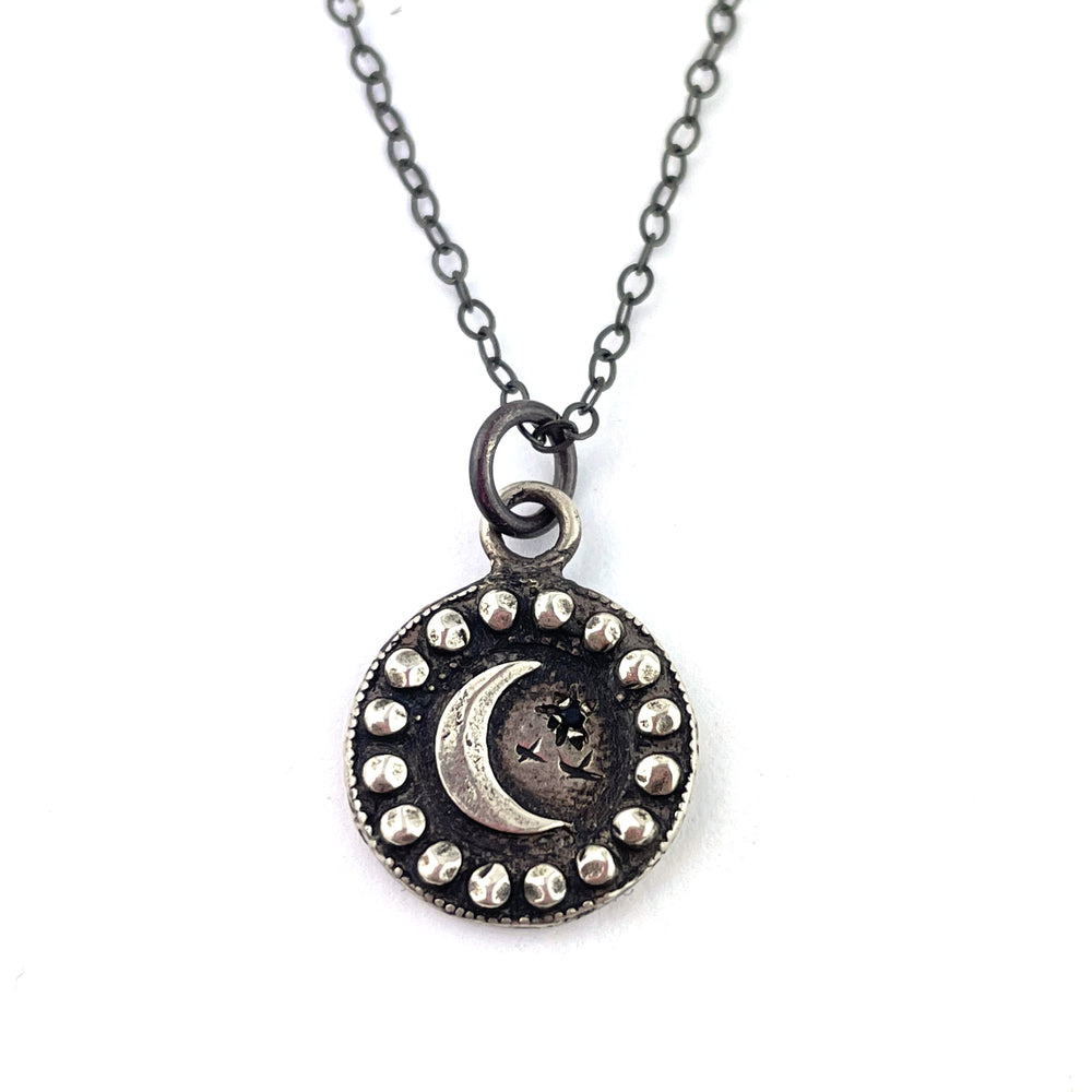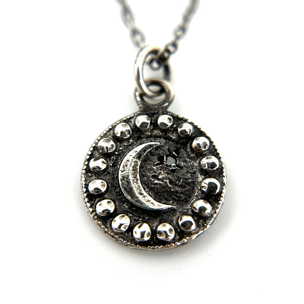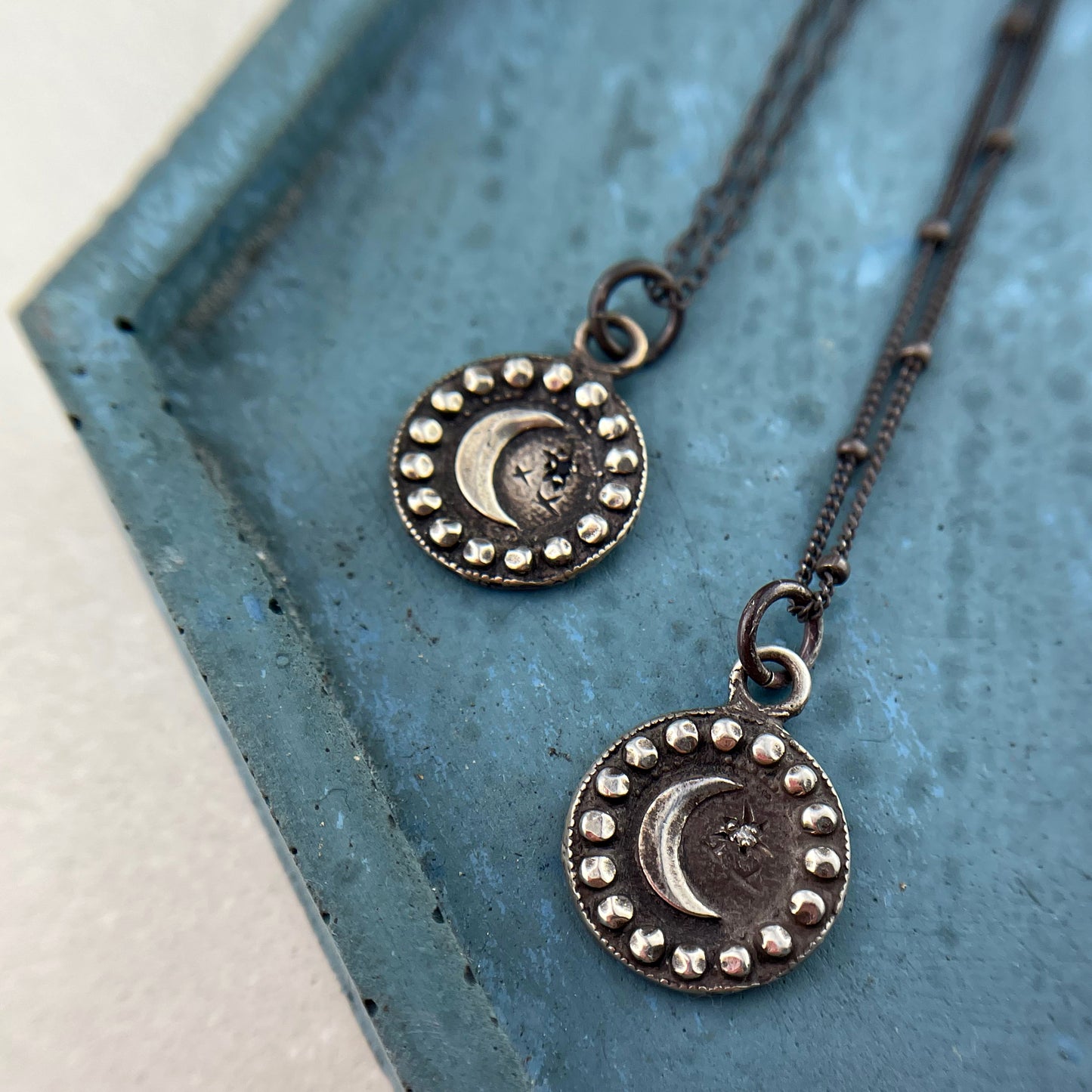 Our crescent moon charm necklace is made from an antique button cast in solid sterling adorned with a shimmering black diamond. Perfect for layering with all our charms and talismans!
