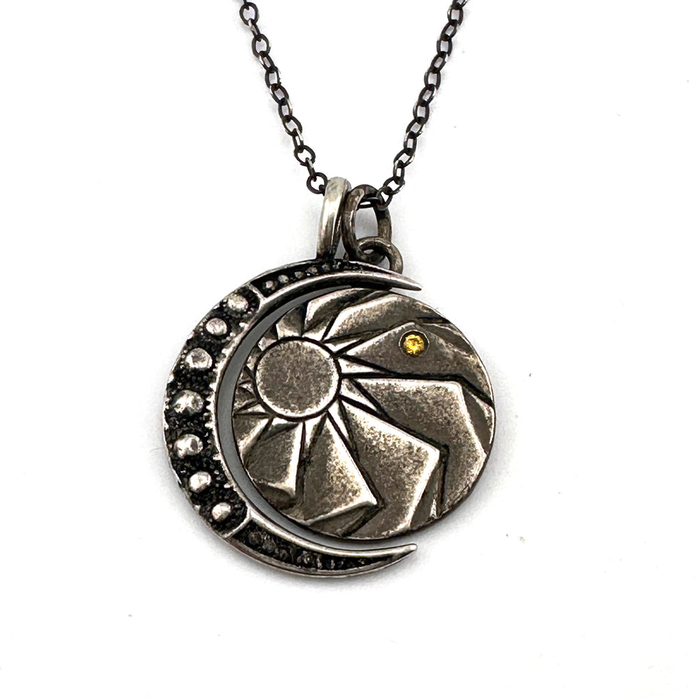 Our Horizon Moon necklace set brings together two of our favorite celestial necklaces: a shimmering crescent moon paired with our Horizons charm. This set conjures the reaches of the night sky, mountain air, waves of water and the first light of sunrise. Made from a vintage button adorned with a 19th century hammered rivet and a yellow sapphire.