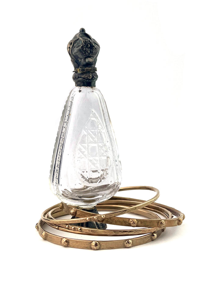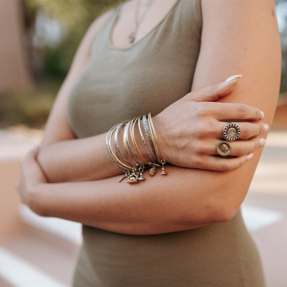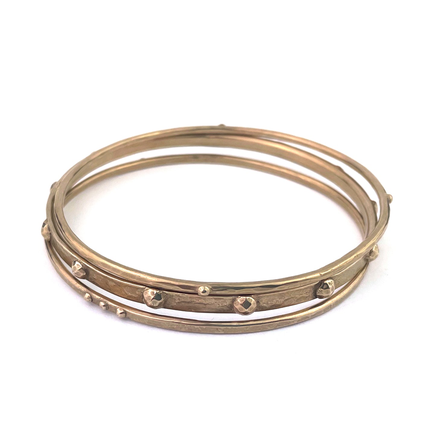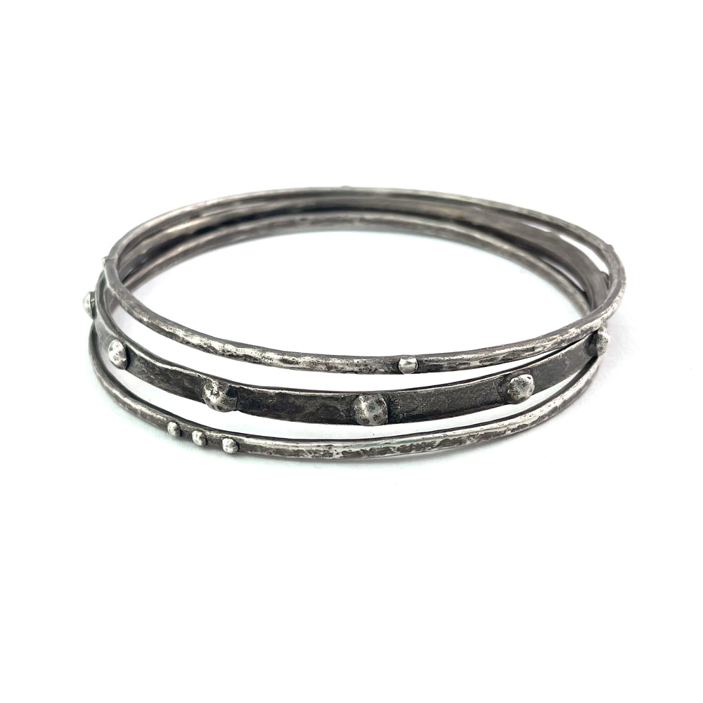 A Special on our suite of three RIVETED bracelet styles - one of each style including two more slender bracelets and one thicker bangle., handmade from hammered bangles adorned with antique hammered cut steel rivets - cast in solid sterling silver. Made to stack.