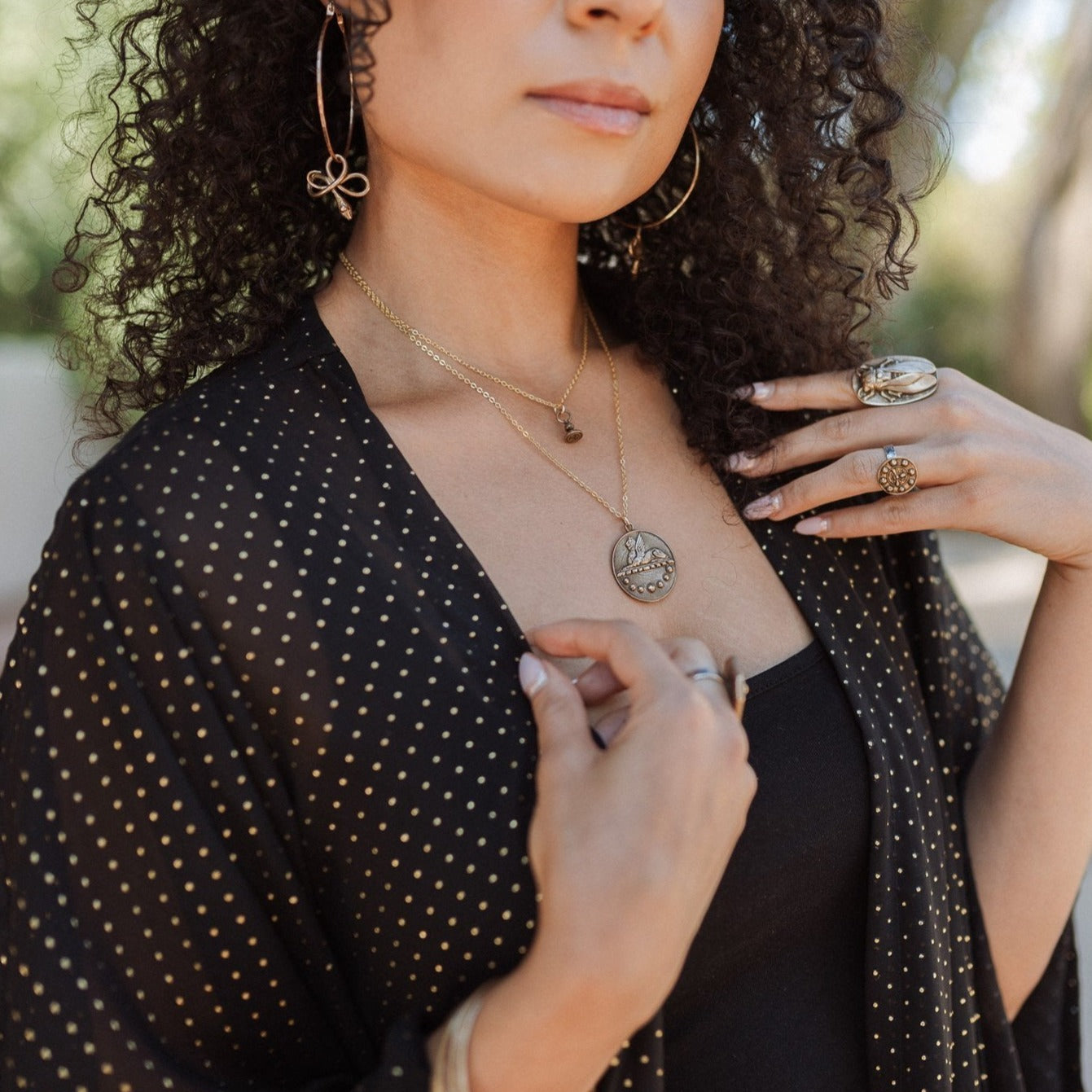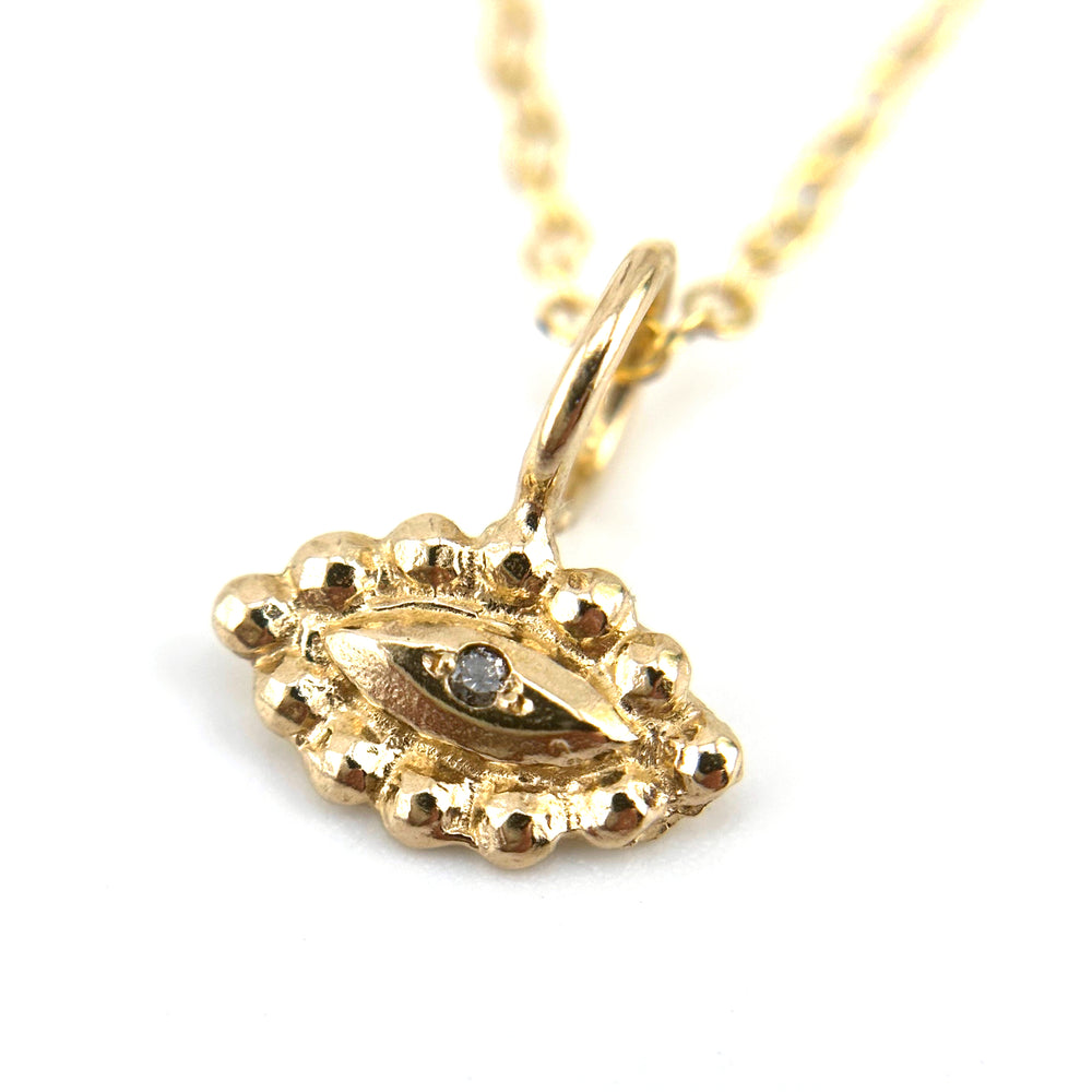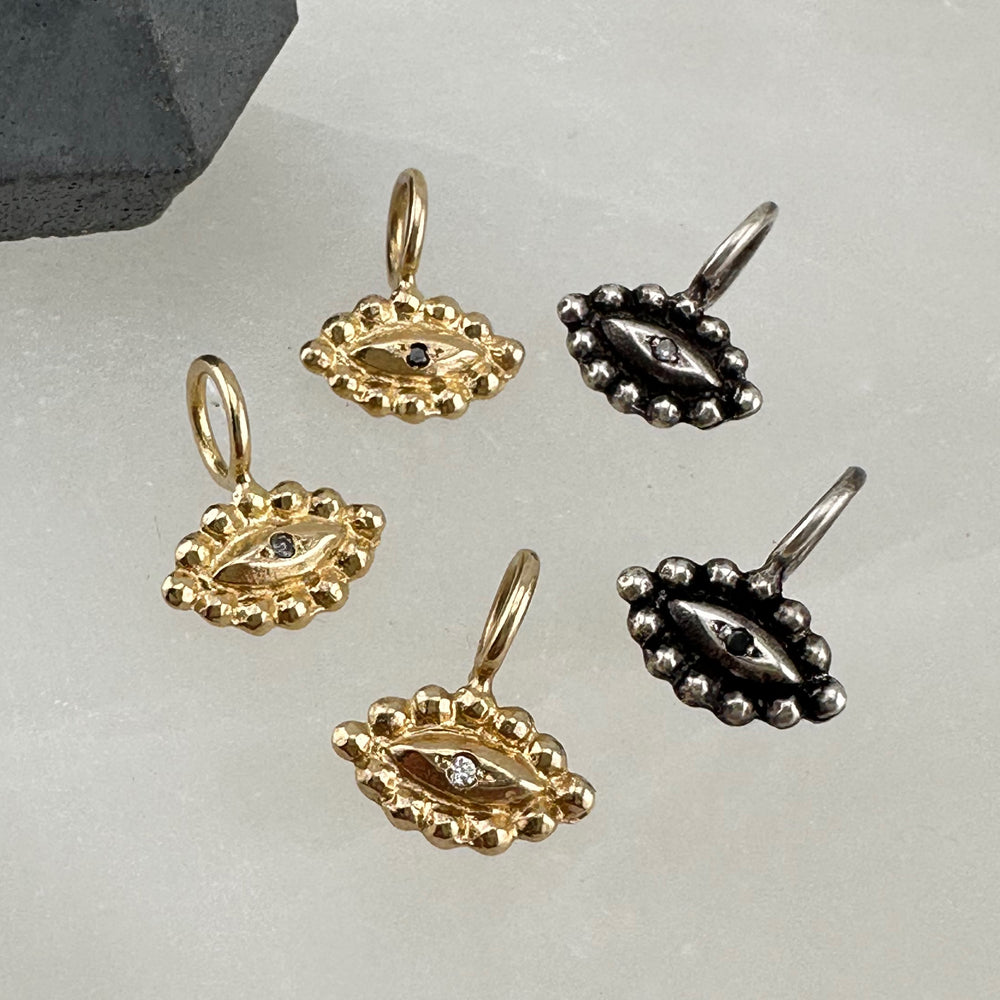 Our SIGHT Evil Eye charm is a sparkling faceted take on an ancient symbol of protection. Thoughtfully made from tiny 19th century shoe buckle rivets. How lovely to think that these tiny artifacts were once part of a history of tight corsets are now a story of bold people like us. Unbuttoned and unbound.